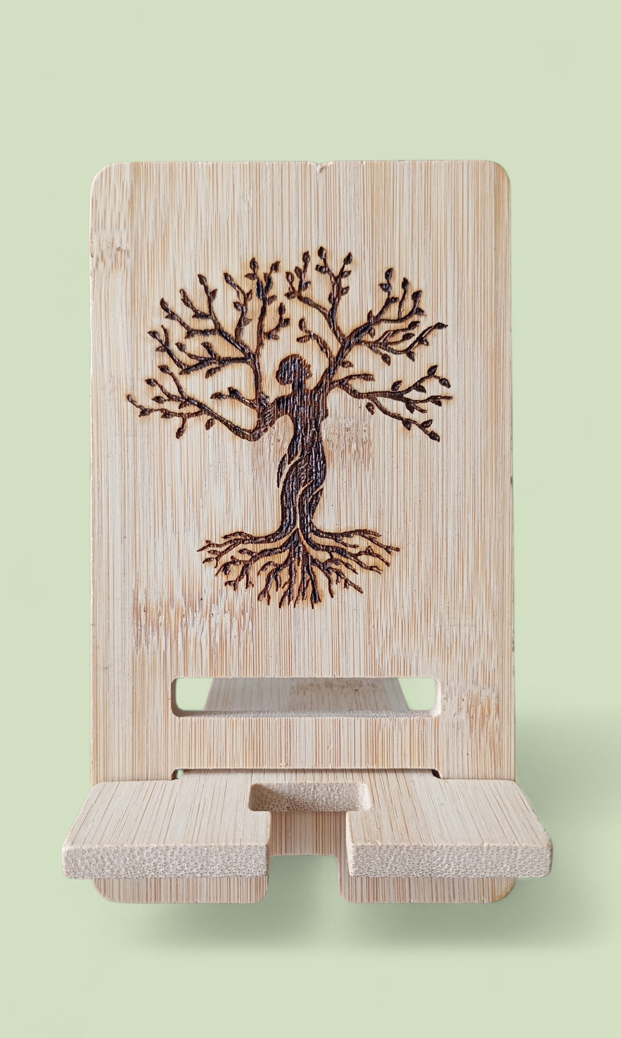 Support de téléphone en bambou, pyrogravé,  pour le bureau : les téléphones portables peuvent afficher des écrans paysage et portrait, libérant ainsi vos mains.