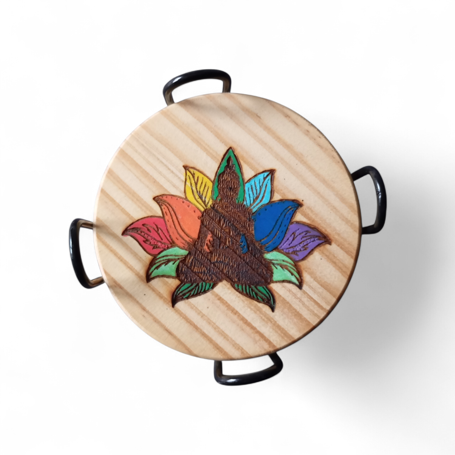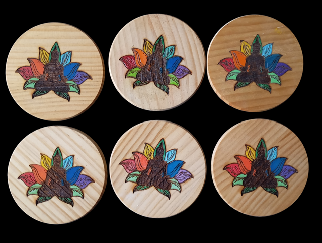 6 dessous de verres, pyrogravés et vernis dans leur support en métal noir.