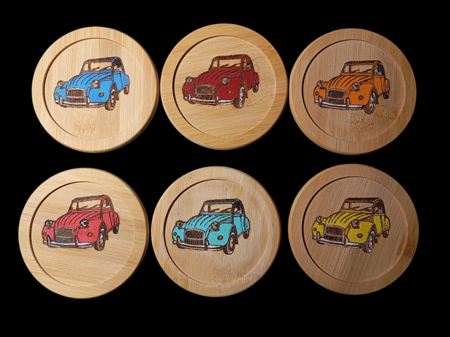 6 dessous de verres, pyrogravés et vernis dans leur support en bambou.