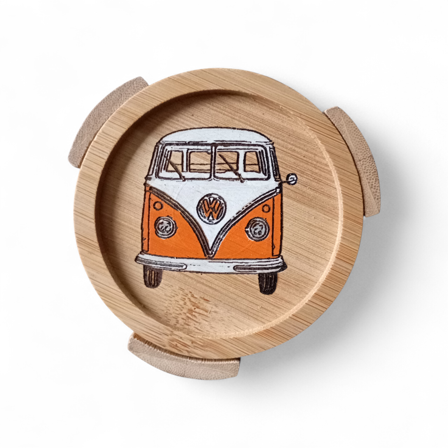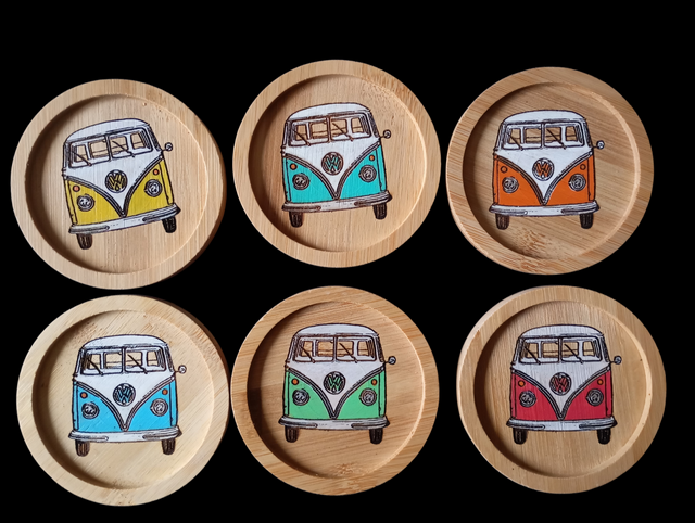 6 dessous de verres, pyrogravés et vernis dans leur support en bambou.