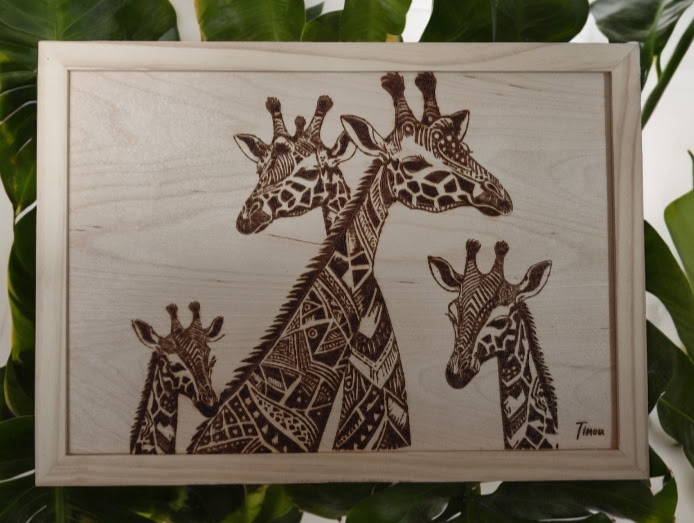 Pyrogravure encadrée sur planche de bouleau.