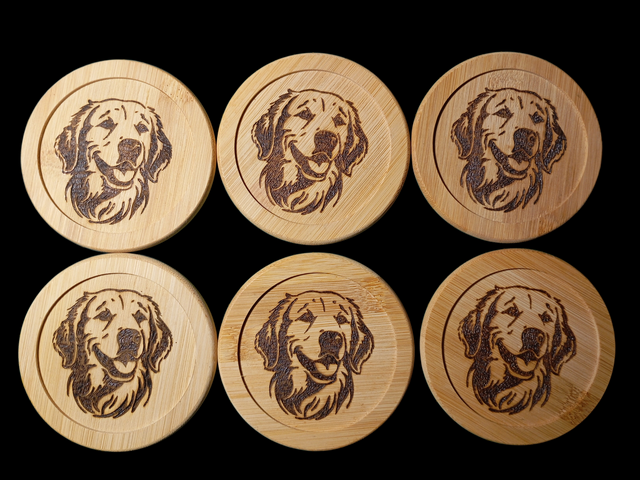 6 dessous de verres, pyrogravés et vernis dans leur support en bambou.