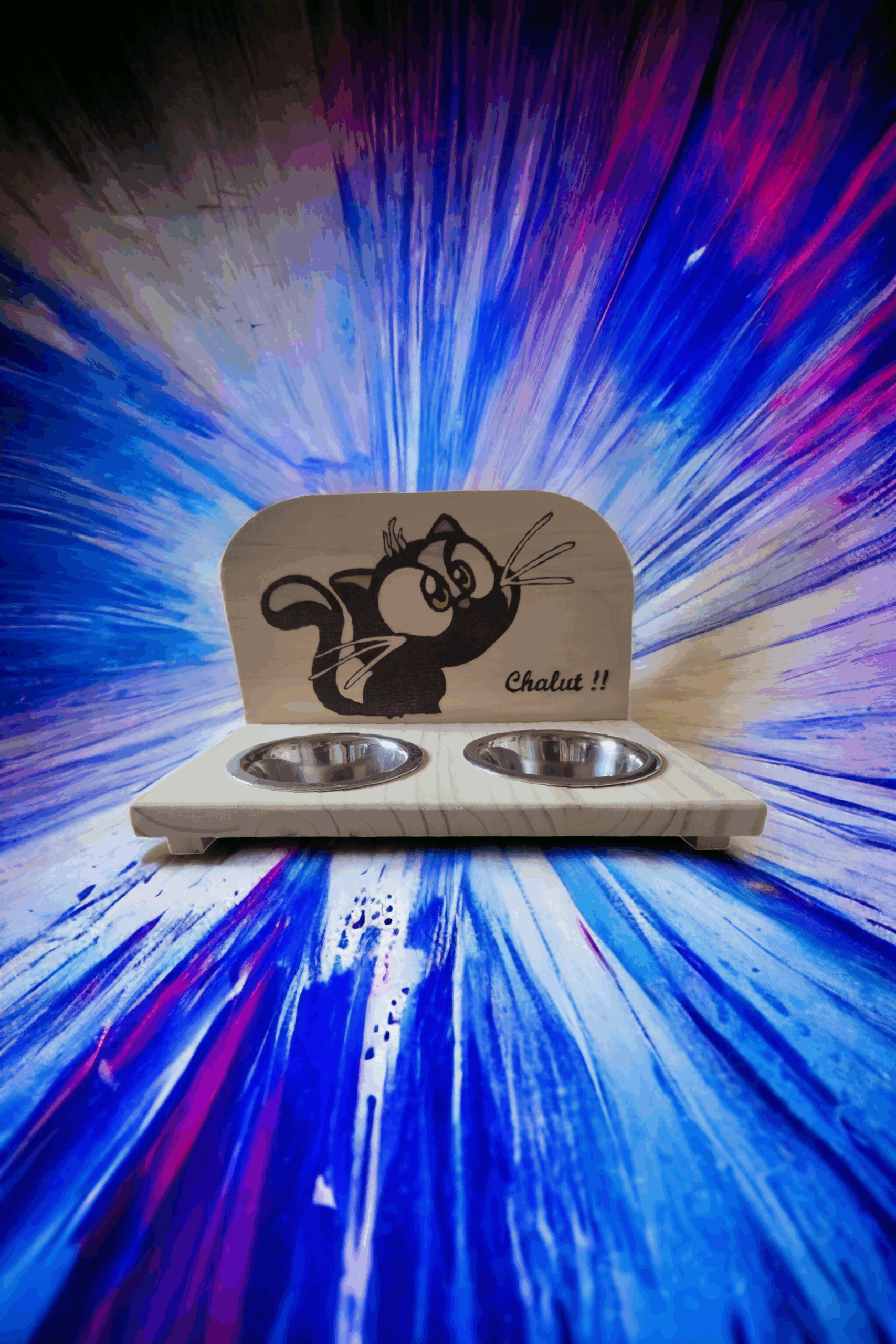 Très joli support de gamelles en bois lasuré, pour votre petit chat. Dimensions : 30x21x18 cm.