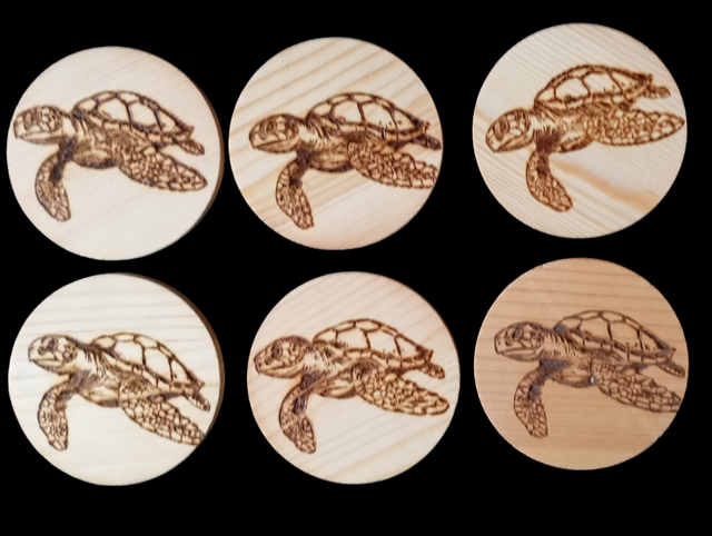 6 dessous de verres, pyrogravés et vernis dans leur support en bambou. Diamètre : 10 cm Modèle unique. Personnalisation possible. D’autres modèles dans ma boutique.